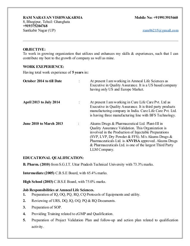 Form Of Resume Sample Quality Control In Pharmaceutical Industry